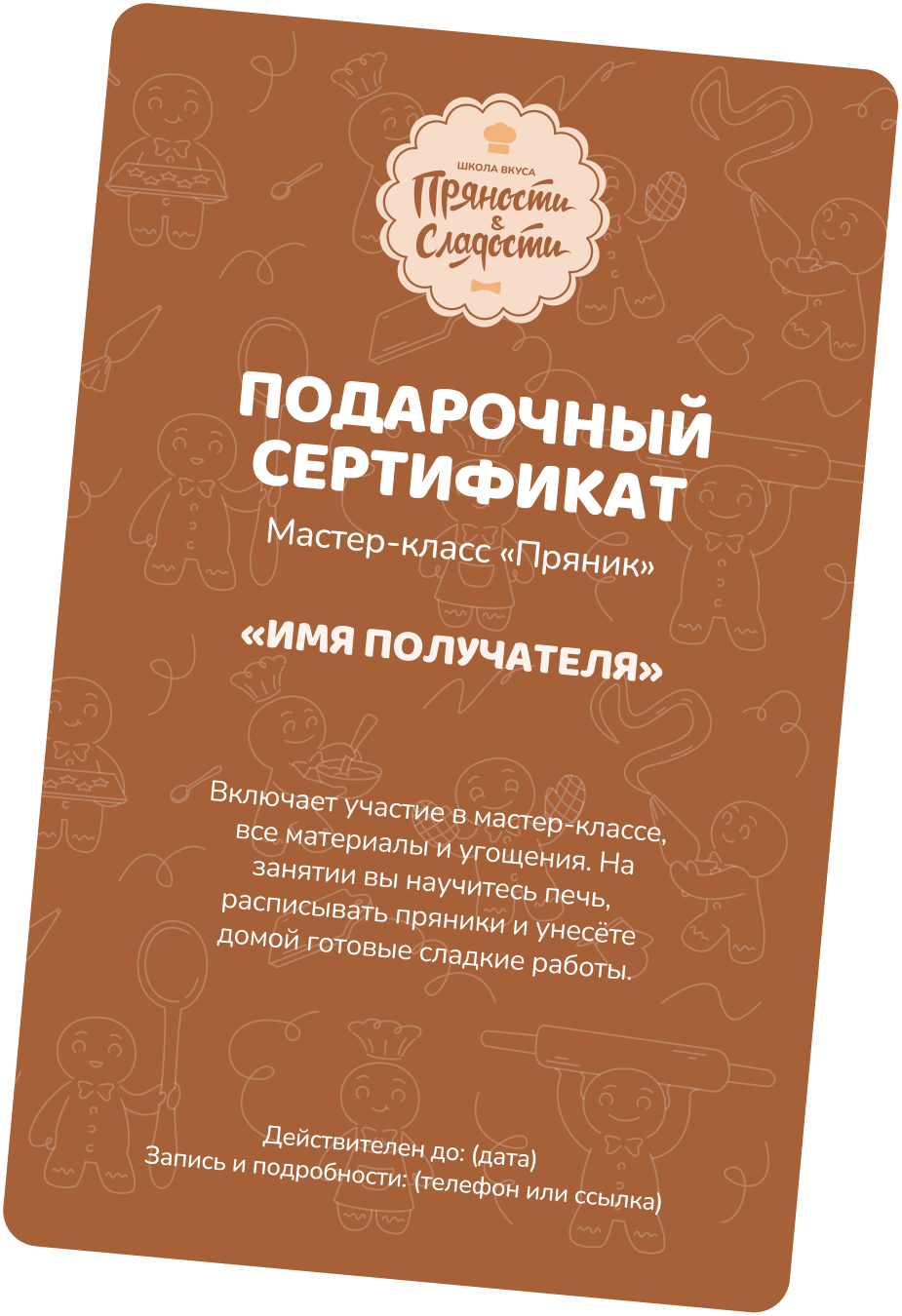 Можно оформить на любые мастер-классы по приготовлению пряников, включая группы и корпоративы.